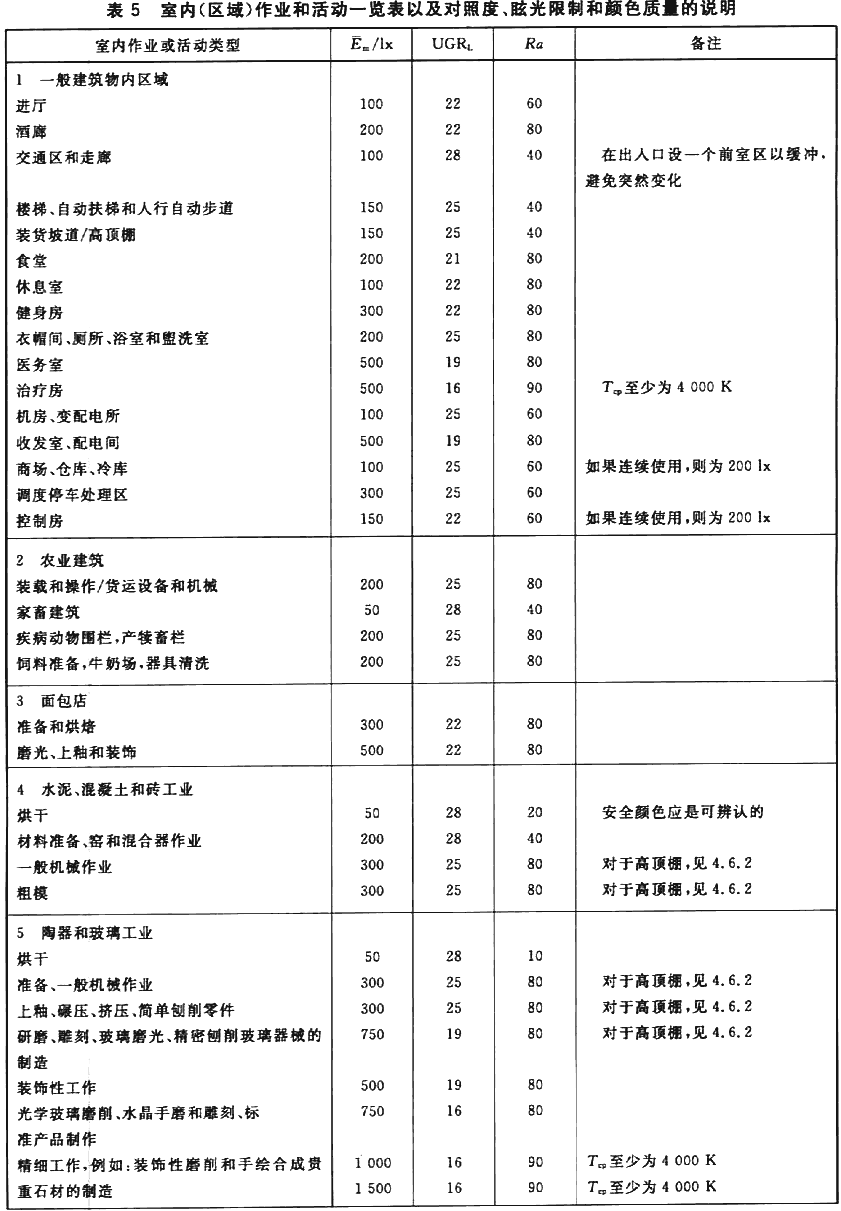 這些區(qū)域的照明標(biāo)準(zhǔn)和照明系統(tǒng)應(yīng)根據(jù)活動區(qū)域、作業(yè)類型和室內(nèi)類型從第5章的一覽表中選取。