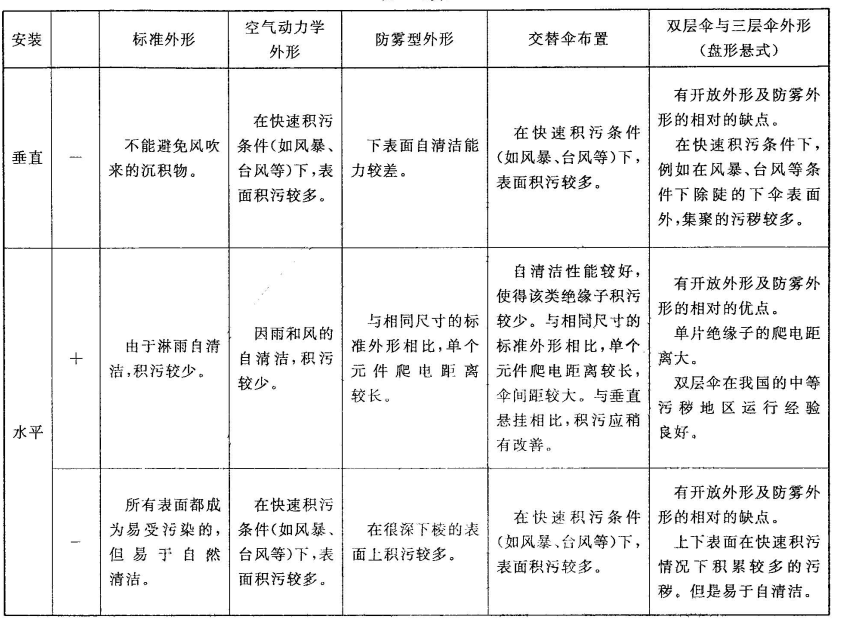下面用表1簡(jiǎn)要說(shuō)明了主要的外形型式相對(duì)于污穢性能的主要優(yōu)點(diǎn)和缺點(diǎn)。