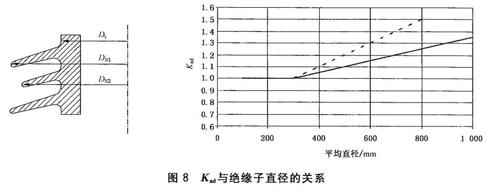 注:校正考慮到了大直徑絕緣子耐受性能的降低和積污減少的綜合影響。圖8中的虛線則表示在同樣情況下不考慮積污影響時(shí)的校正,例如人工污穢試驗(yàn)時(shí)。