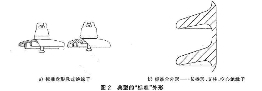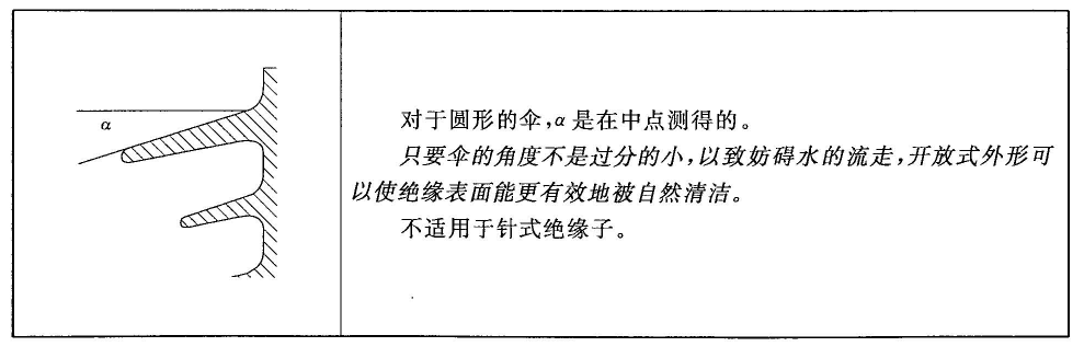 注:在長(zhǎng)棒形、支柱和空心絕緣子情況下,典型的標(biāo)準(zhǔn)外形的傘傾角是,傘的上表面的傘傾角a為14°~24°,傘的下表面的傘傾角β是8°~16°(示于圖2b))。通常,較小的角度考慮作為空氣動(dòng)力學(xué)形,較大的角度考慮作為防霧型。