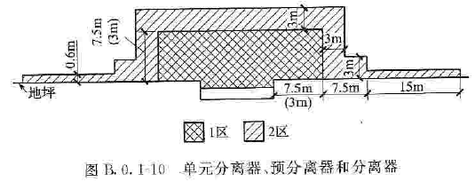 10 對(duì)于開(kāi)頂貯罐或池的生物氧化裝置(圖B.0.1-2),當(dāng)液體表面處為連續(xù)級(jí)釋放源時(shí),開(kāi)頂貯罐或池壁外水平距離半徑為3m,液體表面上方至地坪上高度為3m的范圍內(nèi)宜劃為2區(qū)。