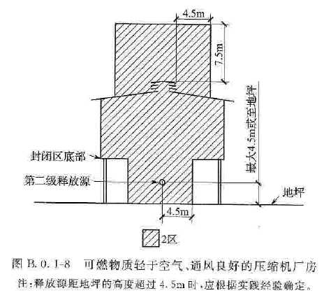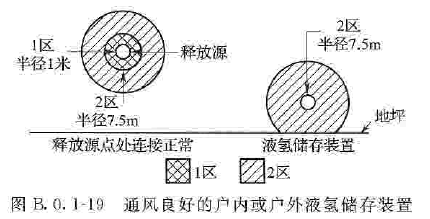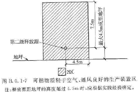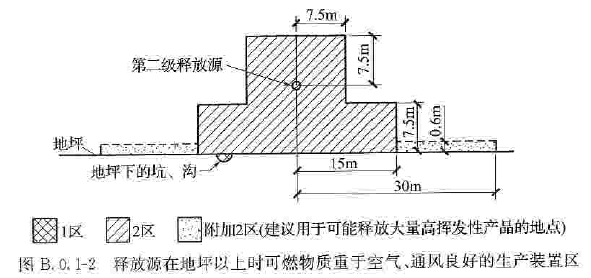 1)釋放源高于地面7.5m以上時(shí)以釋放源為中心,半徑為1m的范闈內(nèi)可劃為1區(qū),以釋放源為中心,半徑為7.5m的范同內(nèi)可劃為2區(qū);