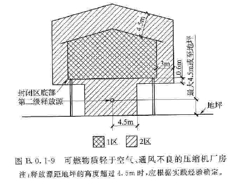 3)當(dāng)可燃物質(zhì)輕于空氣時(shí),以釋放源為中心,半徑為4.5m的范圍內(nèi)可劃為2區(qū)。