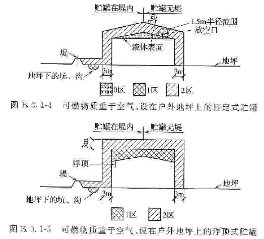 3 對(duì)于可燃物質(zhì)重于空氣的貯罐(圖B.0.1-4和圖B.0.1-5),爆炸危險(xiǎn)區(qū)域的范圍劃分宜符合下列規(guī)定: