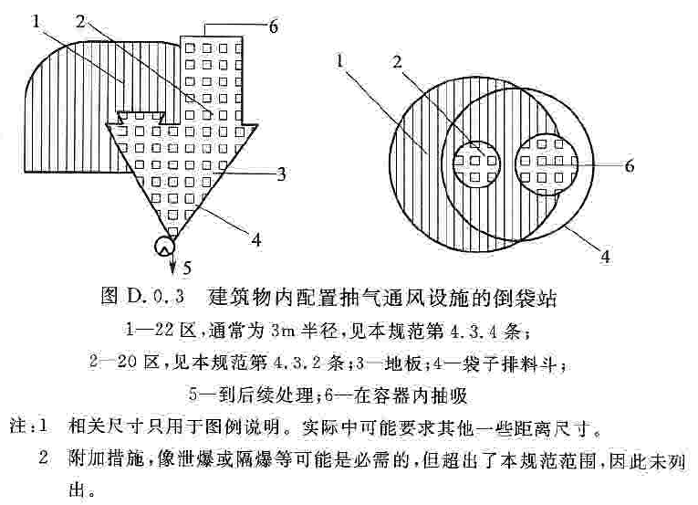 注:如果粉塵層堆積,則考慮了粉塵層的范圍以及擾動(dòng)該粉塵層產(chǎn)生粉塵云的情況和現(xiàn)場(chǎng)的清理水平(見(jiàn)附錄D)后.可以要求更進(jìn)一步的細(xì)分類。如果在粉塵袋子放空期間因空氣的流動(dòng)可能偶爾攜帶粉塵云超出了21區(qū)范圍,則劃為22區(qū)。