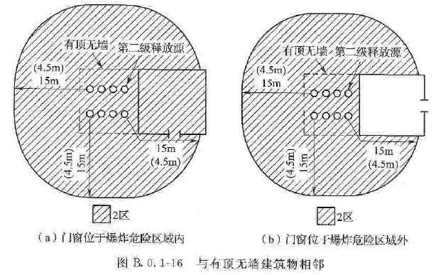 14 無(wú)釋放源的生產(chǎn)裝置區(qū)與有頂無(wú)墻建筑物且有第二級(jí)釋放源的爆炸性氣體環(huán)境相鄰(圖B.0.1-16),并用非燃燒體的實(shí)體墻隔開(kāi),其爆炸危險(xiǎn)區(qū)域的范圍劃分宜符合下列規(guī)定: