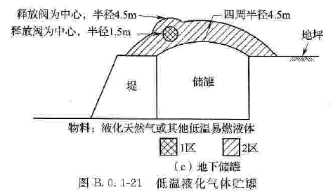 19 低溫液化氣體貯罐的危險(xiǎn)區(qū)域劃分宜符合下列規(guī)定(圖B.0.1-21):