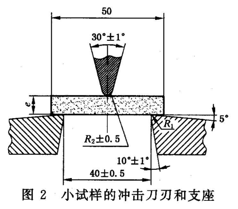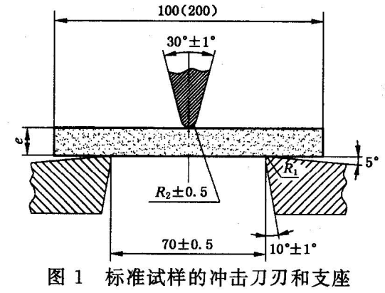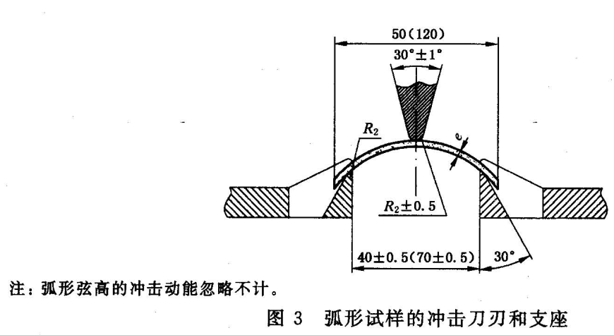 b) 擺錘應(yīng)能提供15 J或50 J的沖擊能量,沖擊刀刃夾角30°±1°,端部圓弧半徑(2±0.5)mm;