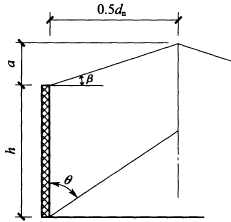 B.0.1 當(dāng)倉壁頂面以上的貯料為錐體、破裂面通過倉的中線(圖B.0.1)時(shí),貯料作用于淺圓倉倉壁上的側(cè)壓力可按下列公式計(jì)算: