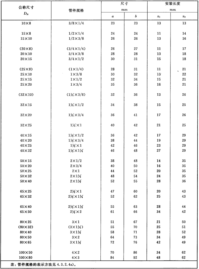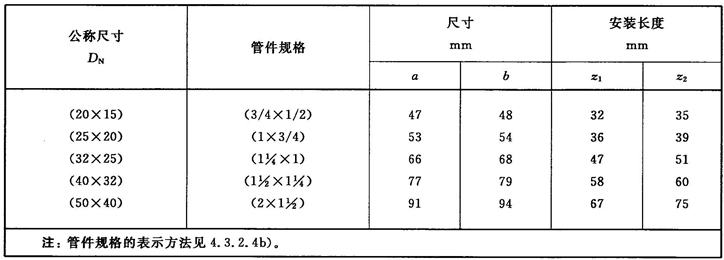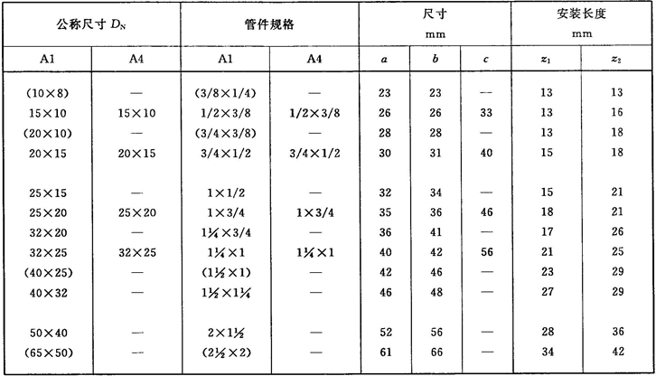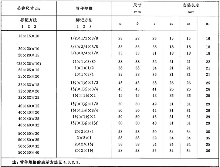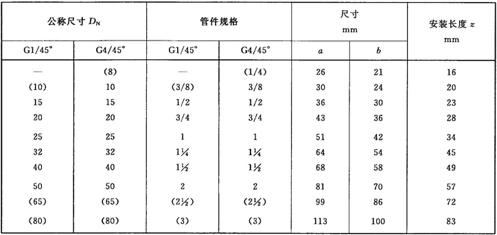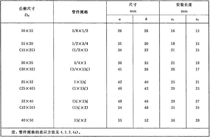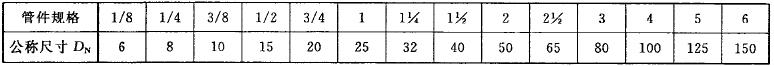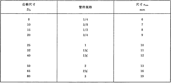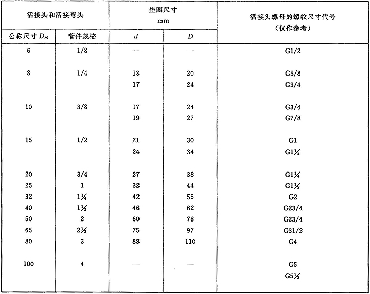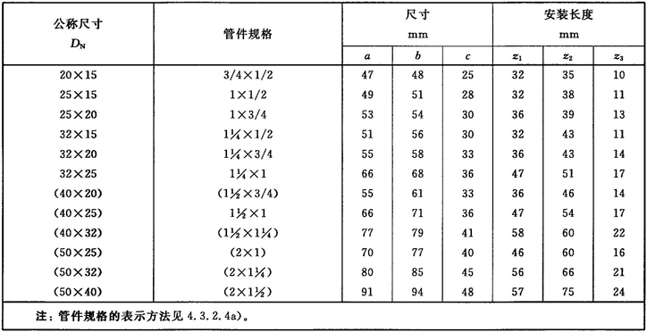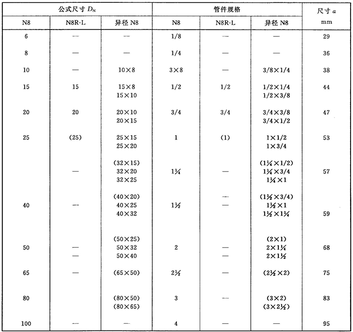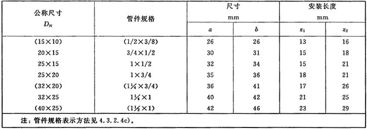 注:管件規(guī)格(即螺紋尺寸代號)與公稱尺寸(DN)之間的關系,見表1。