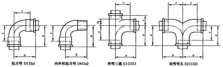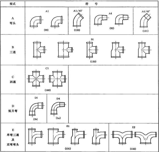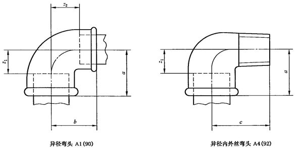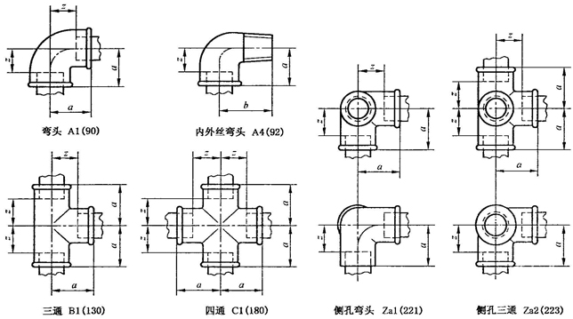 A.1 彎頭、三通、四通型式尺寸應符合圖A.1、表A.1的規(guī)定。