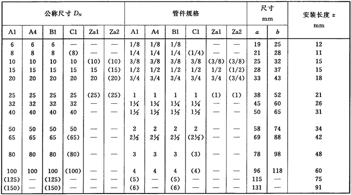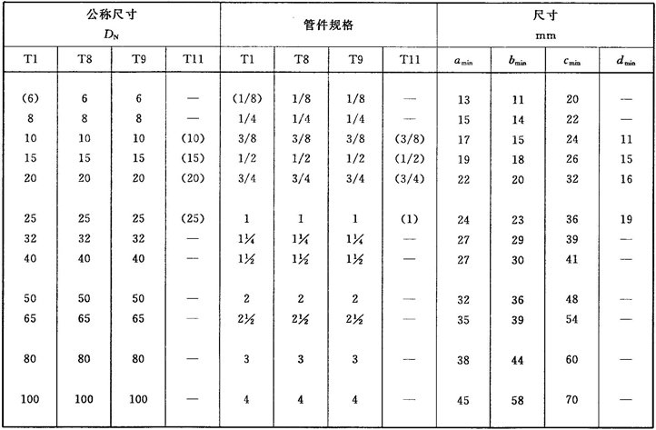 圓括弧中的管件尺寸為可選擇尺寸,由制造方自行規(guī)定,沒有特殊規(guī)定,管螺紋應符合GB/T 7306.1或GB/T 7306.2的規(guī)定。
