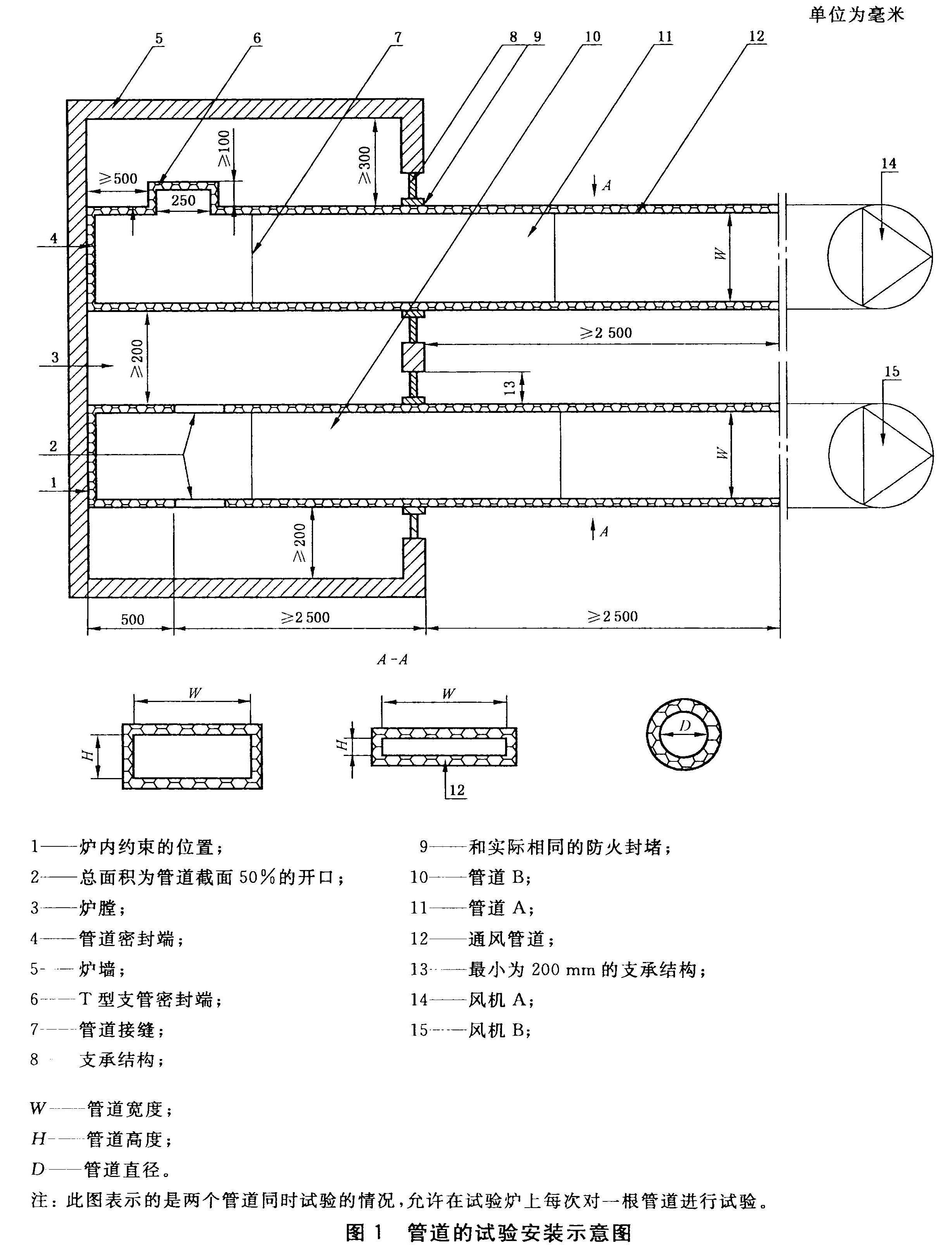 本標(biāo)準(zhǔn)規(guī)定了水平通風(fēng)管道在標(biāo)準(zhǔn)火條件下的耐火性能試驗(yàn)方法,用來檢驗(yàn)通風(fēng)管道承受外部火(管道A)和內(nèi)部火(管道B)作用時(shí)的耐火性能。垂直管道的耐火試驗(yàn)可參照本標(biāo)準(zhǔn)執(zhí)行。