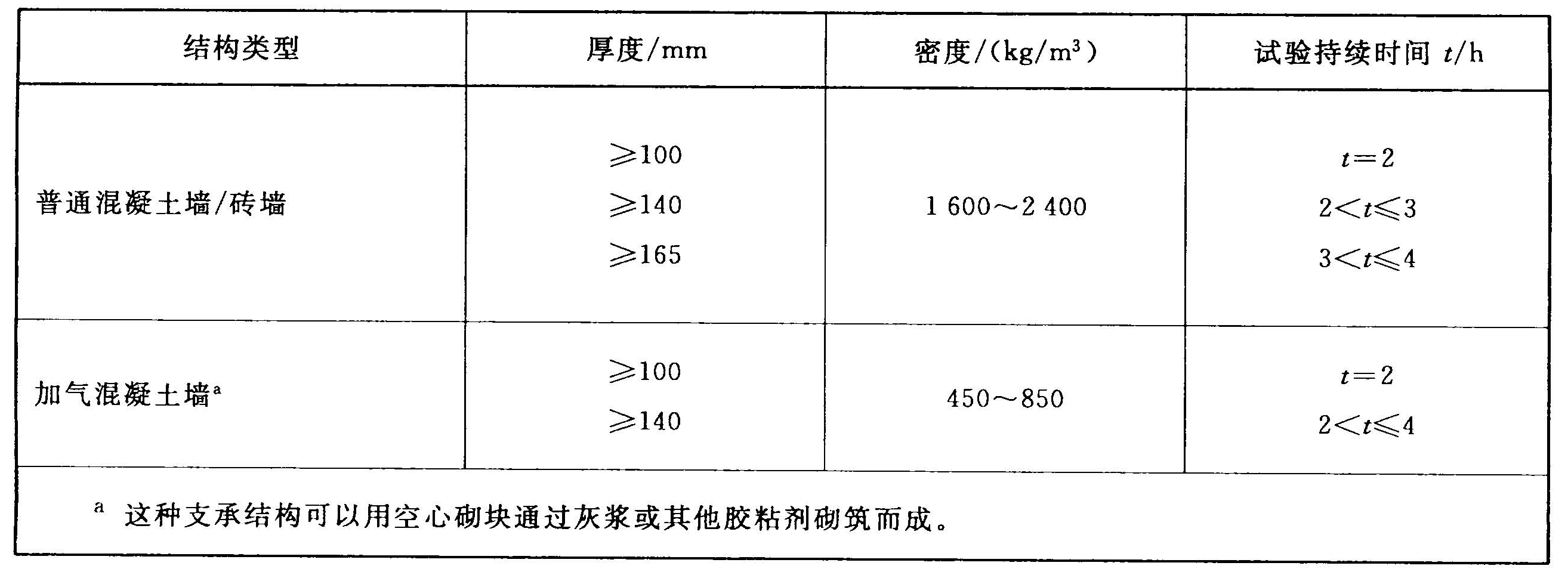 管道穿過標(biāo)準(zhǔn)支承結(jié)構(gòu)(見表3和表4)進(jìn)行試驗(yàn)所獲得的試驗(yàn)結(jié)果適用于耐火時(shí)間等于或大于試驗(yàn)用標(biāo)準(zhǔn)支承結(jié)構(gòu)的支承結(jié)構(gòu)。