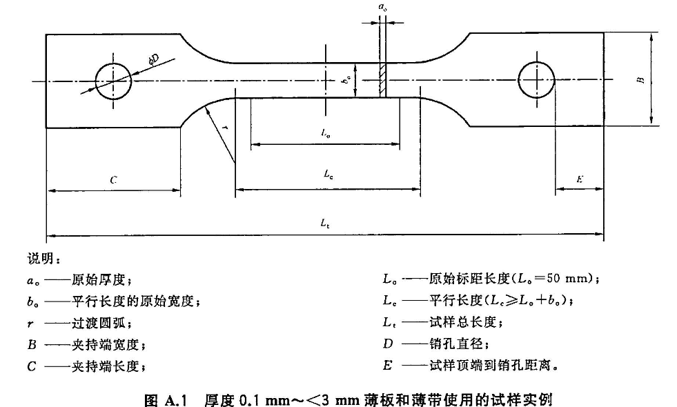 A.2 試樣的尺寸厚度0.1 mm~<3 mm薄板和薄帶使用的試樣類型