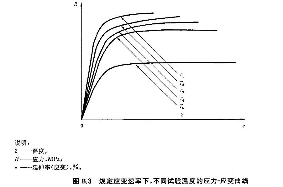 圖B.3表明,規(guī)定應(yīng)變速率下,該材料不同試驗溫度對應(yīng)的應(yīng)力一應(yīng)變曲線存在較大差異(T1<T2<T3<T4<T5)。