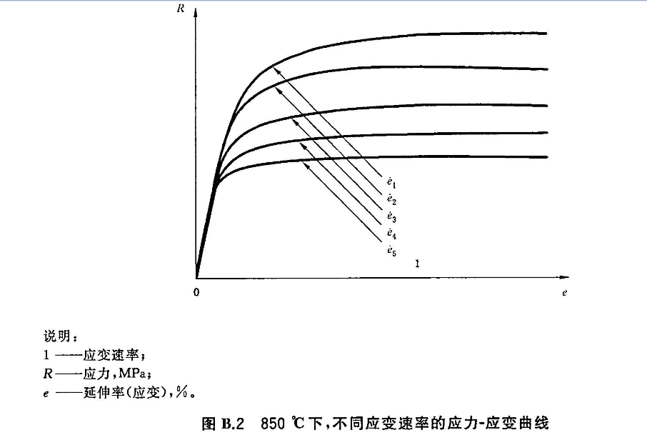 圖B.2表明,高溫(850℃)條件下,該材料不同的應(yīng)變速率對應(yīng)的應(yīng)力一應(yīng)變曲線存在較大差異(e1>e2>e3>e4>e5)。
