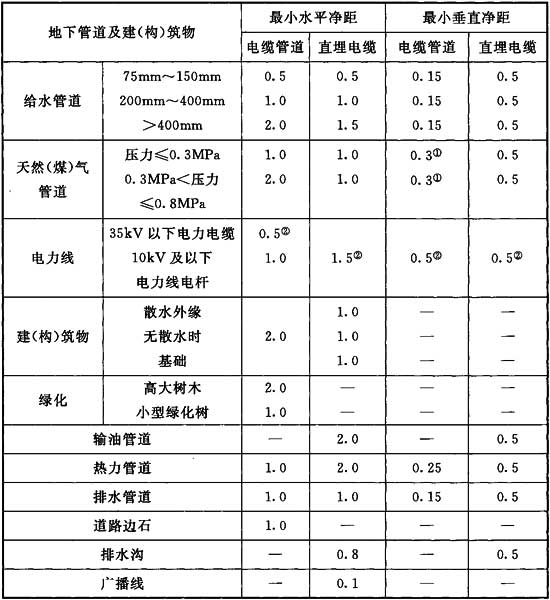 注:①交越處2m之內(nèi)天然(煤)氣管道不得有接口,否則電纜及電纜管道應(yīng)加包封。