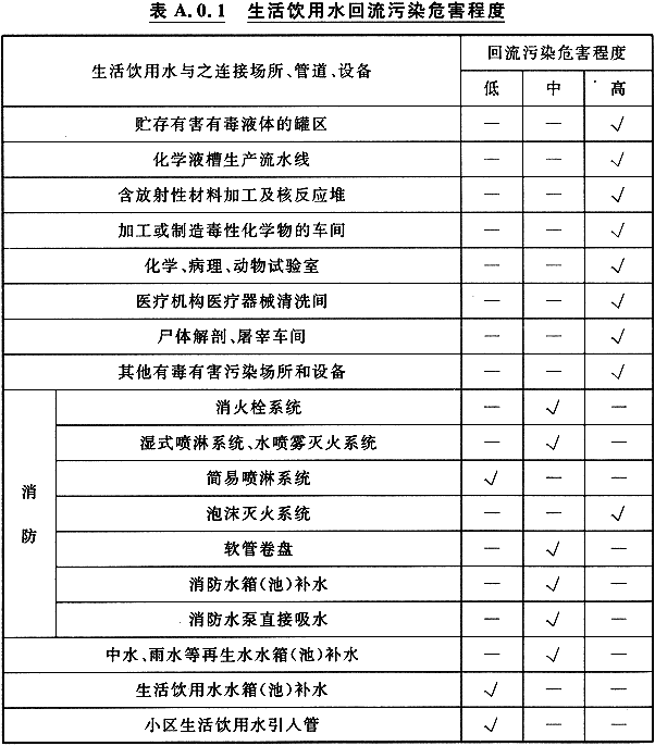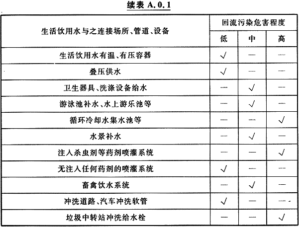 A.0.1 生活飲用水回流污染危害程度應符合表A.0.1的規(guī)定。