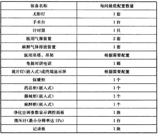 6.0.1 每間潔凈手術(shù)室配備的與平面布置和建筑安裝有關(guān)的基本裝備,宜符合表6.0.1的規(guī)定。