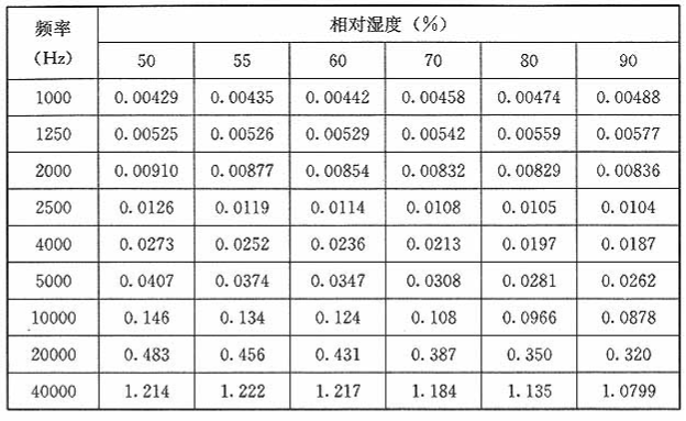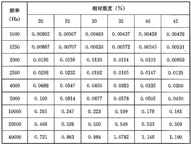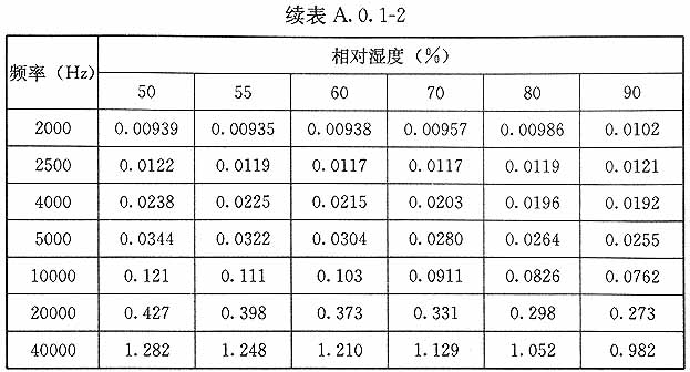 表A.0.1-1 標(biāo)準(zhǔn)大氣壓(101.325kPa)時空氣吸收系數(shù)4m值,室溫20°C