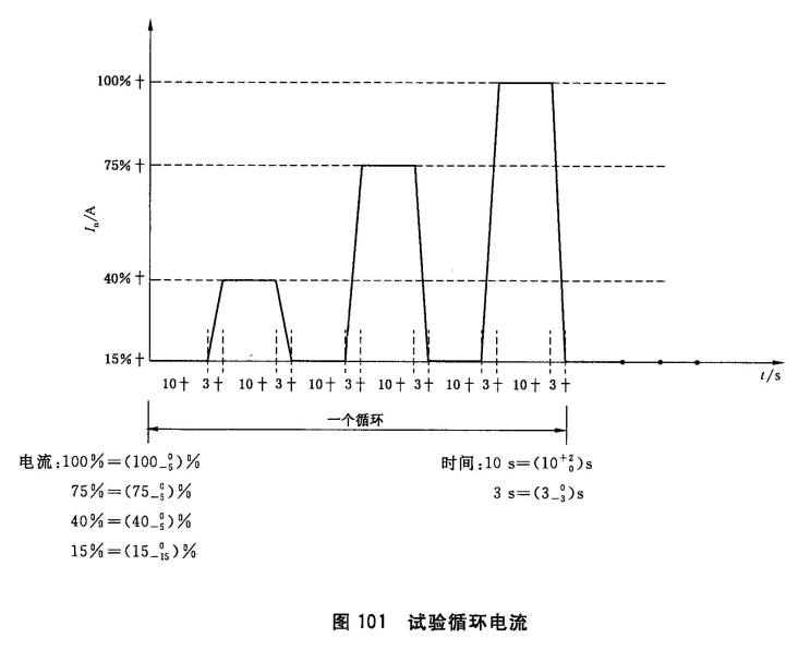 a) 1個(gè)最大額定電流的熔斷體試品和1個(gè)最小額定電流的熔斷體試品各經(jīng)受溫度為50℃土5℃,時(shí)間為3h或直到溫度達(dá)到穩(wěn)定的溫度處理。每個(gè)熔斷體通以其額定電流(In),時(shí)間等于表101規(guī)定的約定時(shí)間。在約定時(shí)間內(nèi)熔斷體不應(yīng)動(dòng)作;
