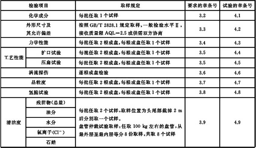 管材出廠應(yīng)進(jìn)行化學(xué)成分、外形尺寸及其允許偏差、力學(xué)性能、擴(kuò)口試驗(yàn)、渦流探傷、晶粒度、清潔度中的殘留物(總量)、油分及水分和表面質(zhì)量的檢驗(yàn)。