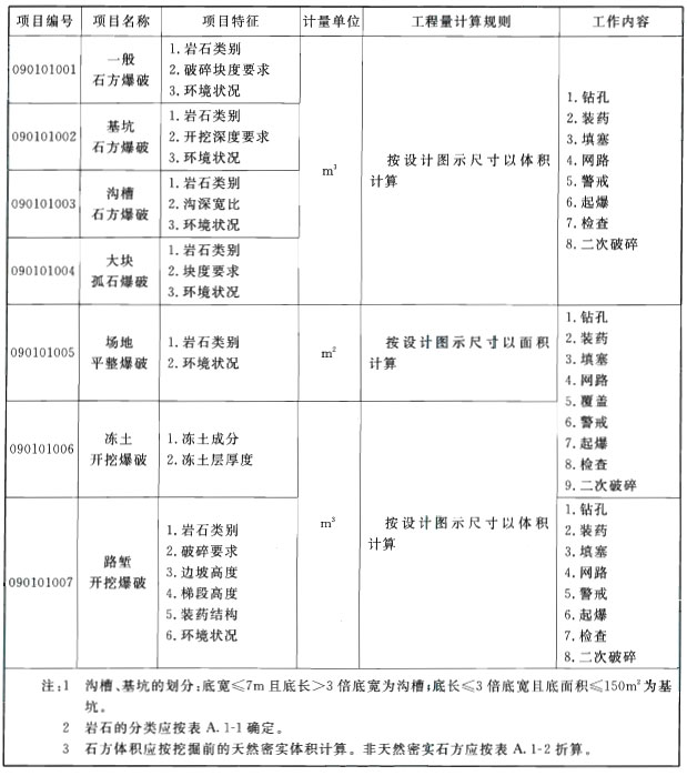 石方爆破工程工程量清單項(xiàng)目設(shè)置、項(xiàng)目特征描述的內(nèi)容、計(jì)量單位及工程量計(jì)算規(guī)則,應(yīng)按表A.1的規(guī)定執(zhí)行。