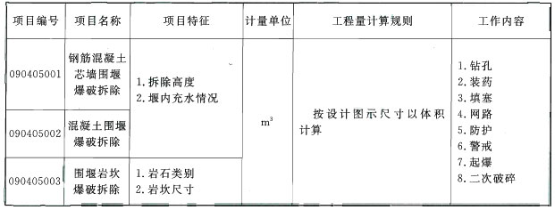 圍堰爆破拆除工程工程量清單項(xiàng)目設(shè)置、項(xiàng)目特征描述的內(nèi)容、計(jì)量單位及工程量計(jì)算規(guī)則,應(yīng)按表D.5的規(guī)定執(zhí)行。