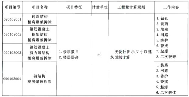 樓房爆破拆除工程工程量清單項(xiàng)目設(shè)置、項(xiàng)目特征描述的內(nèi)容、計(jì)量單位及工程量計(jì)算規(guī)則,應(yīng)按表D.2的規(guī)定執(zhí)行。