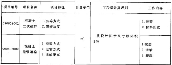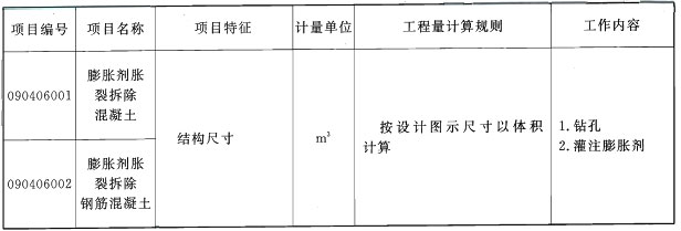 膨脹劑破碎拆除工程工程量清單項(xiàng)目設(shè)置、項(xiàng)目特征描述的內(nèi)容、計(jì)量單位及工程量計(jì)算規(guī)則,應(yīng)按表D.6的規(guī)定執(zhí)行。