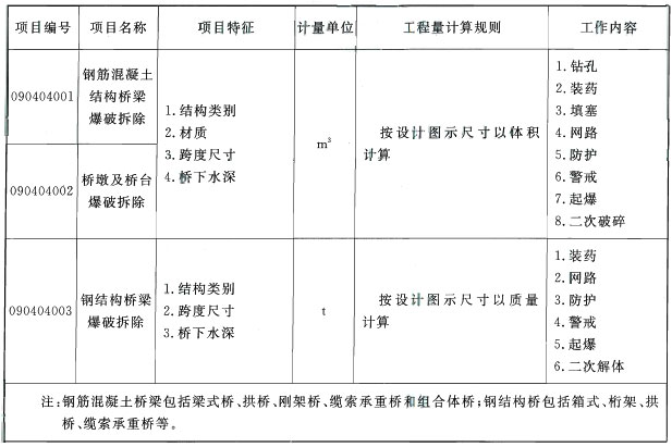 橋梁爆破拆除工程工程量清單項(xiàng)目設(shè)置、項(xiàng)目特征描述的內(nèi)容、計(jì)量單位及工程量計(jì)算規(guī)則,應(yīng)按表D.4的規(guī)定執(zhí)行。