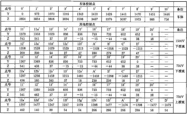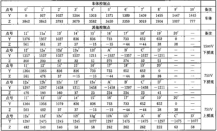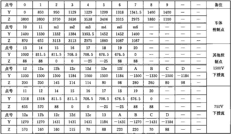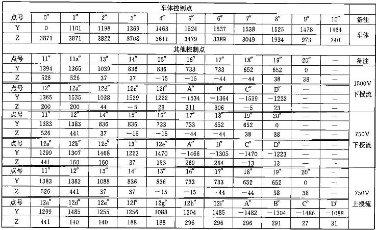 注:1 表中第0~11點(diǎn)是車體上的控制點(diǎn);13~14點(diǎn)是軸箱簧下控制點(diǎn);15~16點(diǎn)是車輛踏面控制點(diǎn);17~18點(diǎn)是輪緣控制點(diǎn);19~20點(diǎn)是齒輪箱控制 點(diǎn);m1~m6點(diǎn)是開門狀態(tài)車門控制點(diǎn);第12~12d點(diǎn)是受電靴工作狀態(tài)控制點(diǎn),12e~12f是受電靴脫靴狀態(tài)控制點(diǎn);A~D受電靴非工作狀態(tài)控制 點(diǎn)。其中11點(diǎn)水平方向?qū)κ芰髌骷败圀w分別計(jì)算,并增加控制一個(gè)點(diǎn),豎向按車底懸掛物計(jì)算;13點(diǎn)水平按照受流器計(jì)算,豎向按照簧下部分計(jì)算。