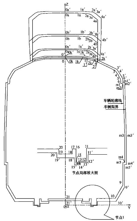 注:表中第0~6、9點(diǎn)是車體上的控制點(diǎn);m1~m5點(diǎn)是開門狀態(tài)下車門控制點(diǎn);第10~11點(diǎn)是轉(zhuǎn)向架上的控制點(diǎn);第12~15點(diǎn)是車輪上的控制點(diǎn);18、19兩點(diǎn)為聯(lián)結(jié)在車軸上的齒輪箱點(diǎn);16、17、20點(diǎn)為聯(lián)結(jié)在轉(zhuǎn)向架構(gòu)架上的信號(hào)接收設(shè)備的最低點(diǎn);第0s、1s、2s、3s、4s點(diǎn)為隧道內(nèi)受電弓控制點(diǎn);第0a、1a、2a、3a、4a點(diǎn)為隧道外受電弓(高度5000m)控制點(diǎn);第0b、1b、2b、3b、4b點(diǎn)為隧道外受電弓(高度4400m)控制點(diǎn)。