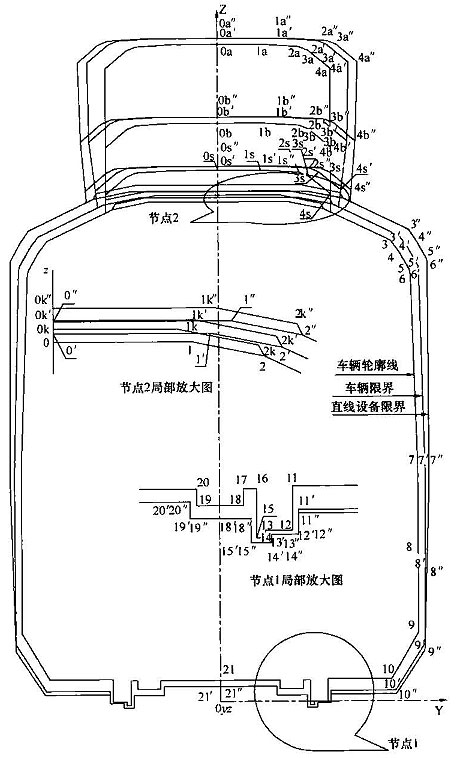 注:1 橫向偏移量計(jì)算值,按車頂處Z=3800mm計(jì)算,車底架下邊梁處加寬量為0,其余各控制點(diǎn)的偏移量采用插入法計(jì)算;