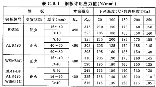 C.0.1殼體結(jié)構(gòu)用鋼許用應(yīng)力值應(yīng)按表C.0.1采用。
