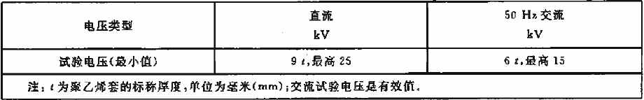 21.9 鋁-聚乙烯粘結護套完整性的試驗方法:電纜應進行火花試驗,非填充式電纜還應進行充氣試驗。火花試驗:應按GB/T 3048.10-2007規(guī)定的方法進行,護套應經(jīng)受表10規(guī)定的試驗電壓而不擊穿。試驗可在擠塑工序上進行。