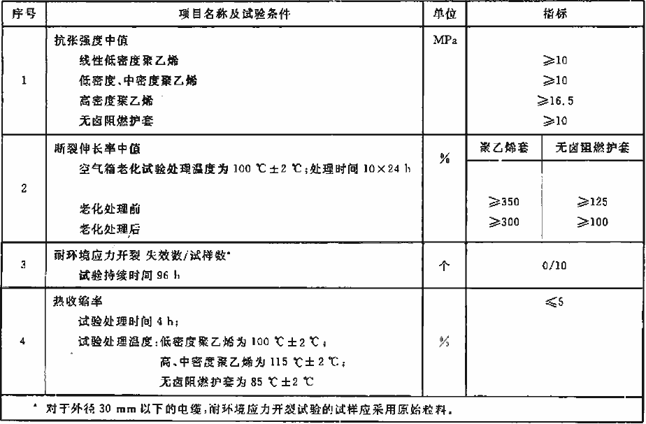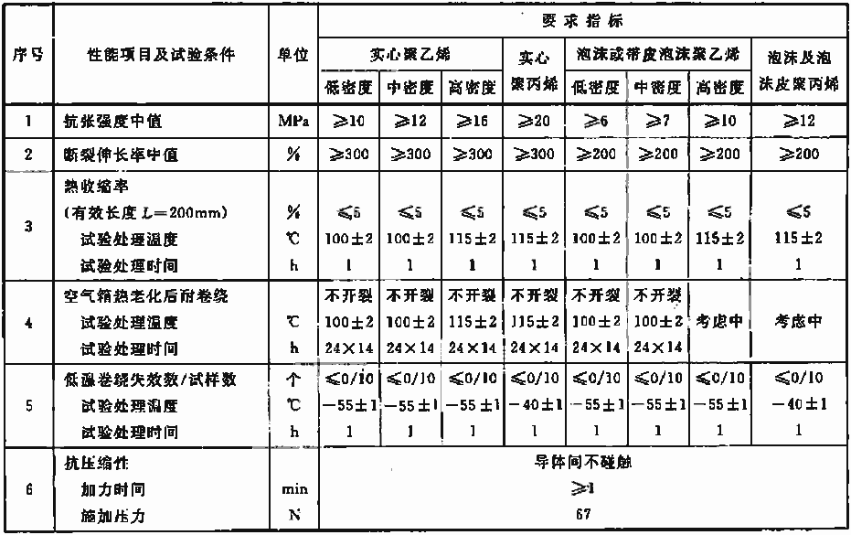 絕緣的機械物理性能應符合表1的規(guī)定,試樣應取自成品電纜。
