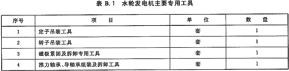 制造廠宜隨同水輪發(fā)電機(jī)提供表B.1開(kāi)列的最小數(shù)量的專用工具,如需變更專用工具的種類和數(shù)量,用戶和制造廠協(xié)商后可應(yīng)在專用技術(shù)協(xié)議或合同中規(guī)定。