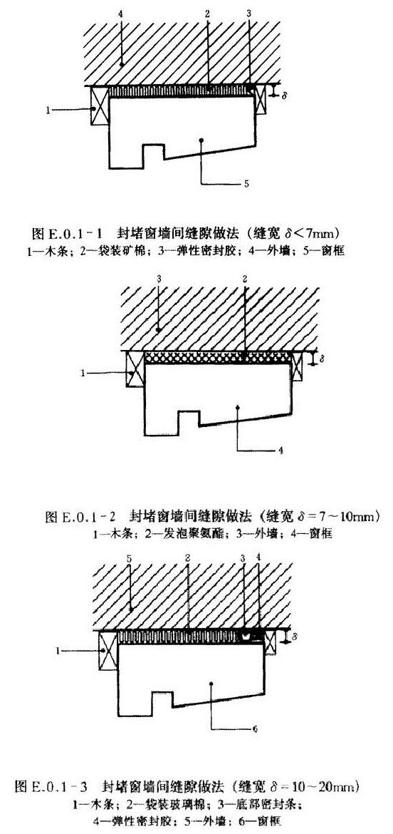E.0.1 封堵窗框與墻體之司的縫隙,可根據(jù)實(shí)際情況選用下列做法之一: