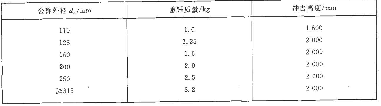 按GB/T 14152―2001的規(guī)定測試,預(yù)處理和試驗溫度為0℃±1℃,狀態(tài)調(diào)節(jié)介質(zhì)為水或空氣,使用d90型重錘,重錘質(zhì)量和沖擊高度見表7。