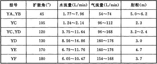 注:表中流量是在0.1MPa~0.3MPa水壓及0.3MPa~0.7MPa氣壓下的數(shù)值。射程是水壓為0.2MPa時的數(shù)值。YA、YB型為單孔噴嘴,其余型號是多孔噴頭。