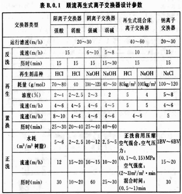 B.0.1 順流再生式離子交換器的設(shè)計(jì)宜符合表B. 0. 1的規(guī)定。