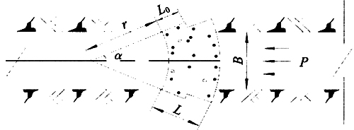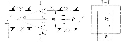 α——凸基座支承面與硐室中心線間夾角(°)。一般取20°~30°,圍巖分類為Ⅰ、Ⅱ類時,取大值;其他類型圍巖時,取小值;