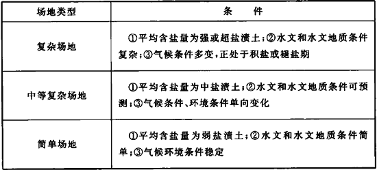 3.0.6 鹽漬土場地應根據(jù)地基土含鹽量、含鹽類型、水文與水文地質(zhì)條件、地形、氣候、環(huán)境等因素按表3.0.6劃分為簡單、中等復雜和復雜三類場地。