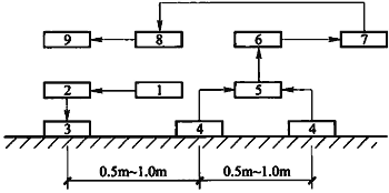 1 在浸水后鹽漬土地面的測點兩邊分別將裝有傳感器的兩個金屬錐釘打入土中,兩釘相距0.5m~1.0m,距其中一個傳感器距離0.5m~1.0m處安放電磁激振器,試驗儀器設(shè)備布置見圖G.0.3-1;
