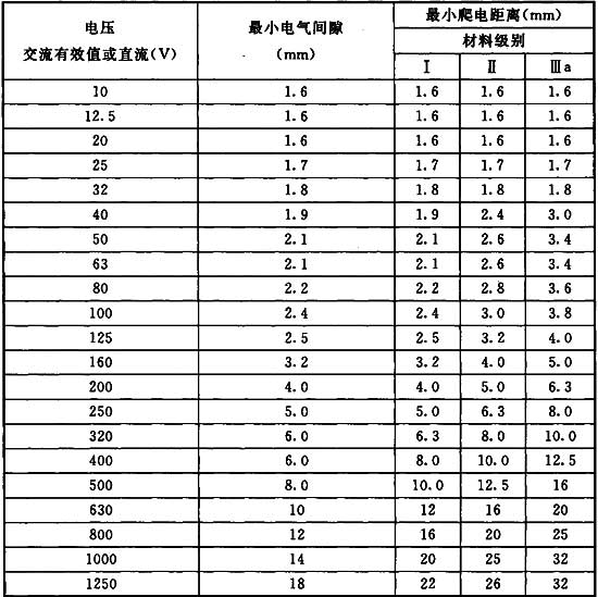 注:1 在確定爬電距離和電氣間隙要求的值時,為了認(rèn)可常用額定電壓范圍,表中的電壓值可增加至表列數(shù)值的1.1倍;