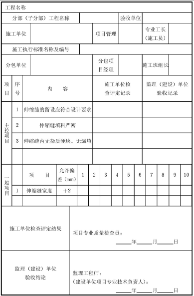 表F.0.5 伸縮縫安裝工程質(zhì)量檢驗(yàn)表