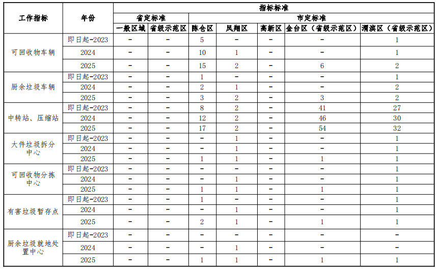 3.按照《寶雞市城市生活垃圾分類規(guī)劃(2020-2035年)》,逐步補齊短板,推進生活垃圾分類配套設(shè)施建設(shè)。年內(nèi)啟動市級生活垃圾分類宣傳培訓(xùn)和宣教基地項目建設(shè);金臺區(qū)做好“兩中心一點”運行管理,年內(nèi)完成垃圾全流程信息化智慧平臺和垃圾中端運輸能力提升項目建設(shè);渭濱區(qū)年內(nèi)完成垃圾分類前端收集、中端運輸能力提升,城鄉(xiāng)智慧平臺、宣教中心和主題公園項目建設(shè);陳倉區(qū)做好“一暫點、兩中心、三站場”項目運行管理;高新區(qū)完善前端收集投放設(shè)施建設(shè);加快生活垃圾焚燒發(fā)電廠項目建設(shè)。