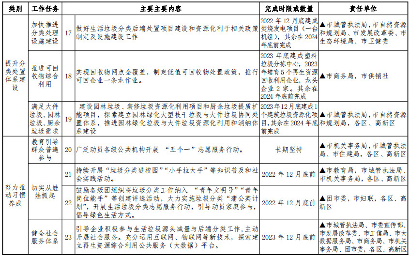 到2023年底,城市垃圾分類體系覆蓋率達到60%以上,居民知曉率和滿意度達到85%以上,投放準確率達到65%以上,廚余垃圾分出率達到15%,回收利用率力爭超過30%,在住建部排名中進入中等城市成效較好行列。